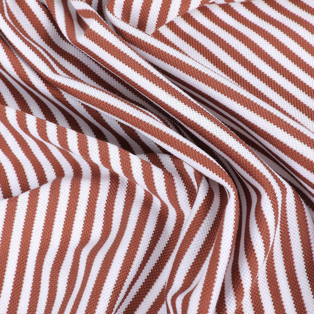 Bumbac cu ochiuri de bumbac cu ochiuri de bumbac cu ochiuri de bumbac cu dungi, adecvat pentru polo, combinat cu tehnologie avansată de tratare a amoniacului lichid, își propune să aducă utilizatorilor un nivel profesional de confort și durabilitate. Bumbacul cu plasă de perle formează o structură de plasă cu procesul său unic de țesut, care îmbunătățește eficient respirabilitatea și absorbția umidității țesăturii. Chiar și în mediile cu temperaturi ridicate, poate efectiv să-și îndepărteze transpirația, să mențină pielea uscată și să îmbunătățească confortul. În același timp, țesătura are o elasticitate bună și o rezistență la uzură, asigurându-se că hainele rămân crocante și elegante după uzura pe termen lung și nu sunt ușor de deformat, satisfacerea cererii utilizatorului pentru durabilitatea îmbrăcămintei. Aplicarea tehnologiei de tratare a amoniacului lichid îmbunătățește în continuare calitatea țesăturii. Prin îmbunătățirea structurii moleculare a fibrelor de bumbac, tratamentul cu amoniac lichid face ca țesătura să fie mai moale și mai netedă, cu o atingere delicată, îmbunătățind în același timp rapiditatea culorii și rezistența ridurilor. Acest lucru înseamnă că utilizatorii pot avea grijă cu ușurință de haine fără să fie călcat după spălare, iar hainele sunt încă luminoase și noi, economisind timp și energie. În ceea ce privește designul, țesătura adoptă elemente clasice cu dungi, care sunt simple generoase și ușor de asortat.